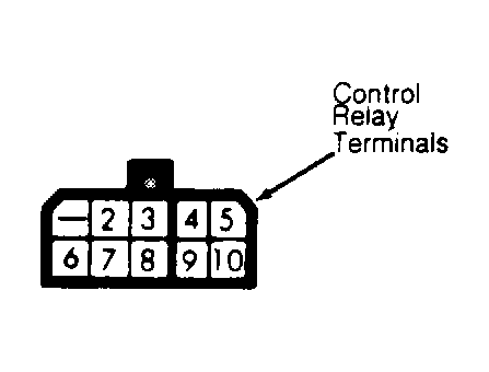 - Apply battery voltage to control relay terminal No. 10. While applying battery voltage to control relay terminal No. 10, ensure battery voltage is not present at terminal No. 4 and 5. See Fig 1