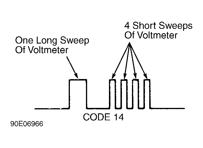 - Ensure all accessories are off. Turn ignition on. Count number of sweeps of voltmeter needle. As an example, one long sweep followed by a short pause followed by 4 short sweeps would indicate a code 14. See Fig 2