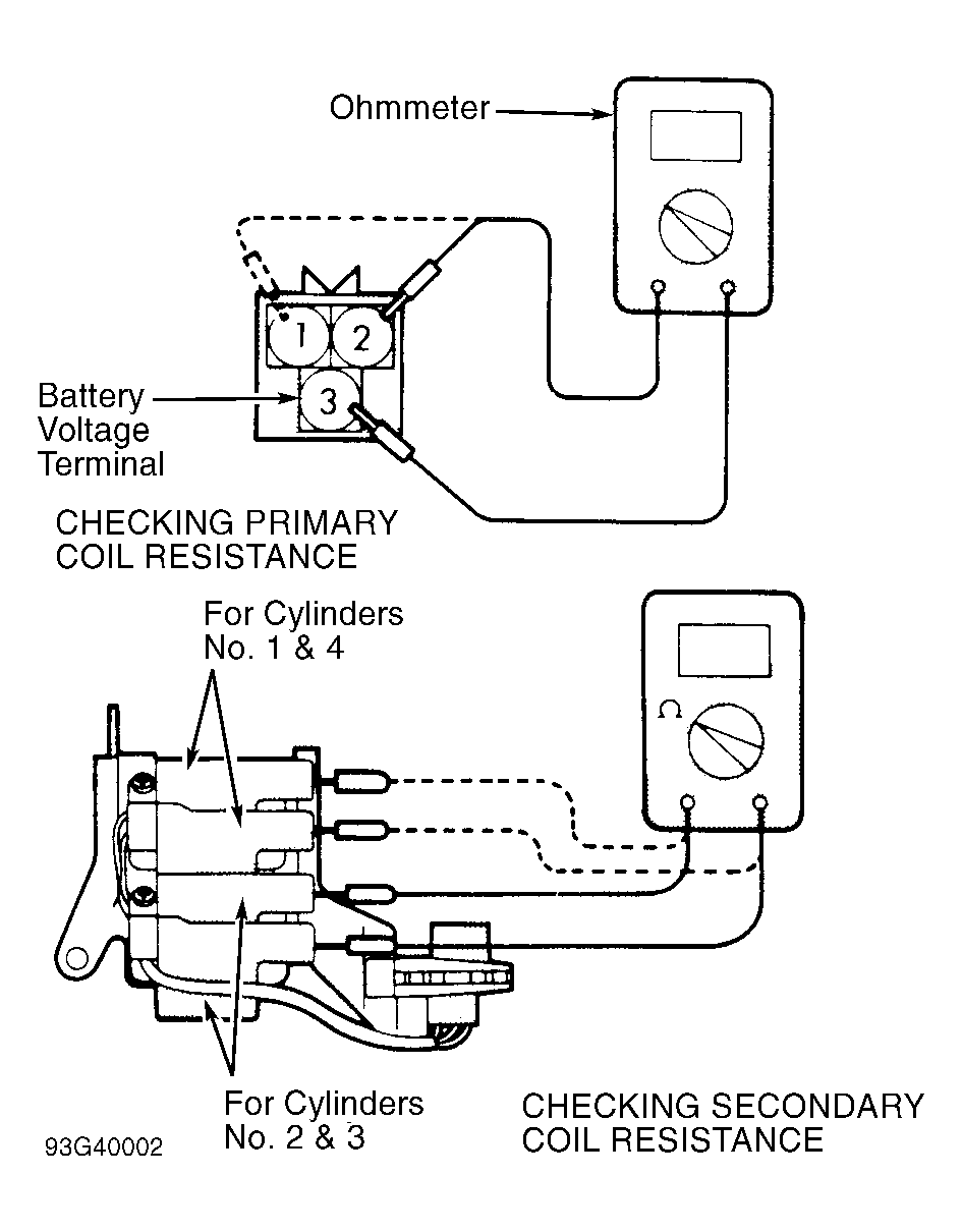 - Measure secondary coil resistance between high voltage tower terminals for cylinders No. 1 and 4, and between high voltage tower terminals for cylinders No. 2 and 3. See Fig 1 . Secondary resistance should be 11,300-15,300 ohms. Replace ignition coil if it does not test as described.