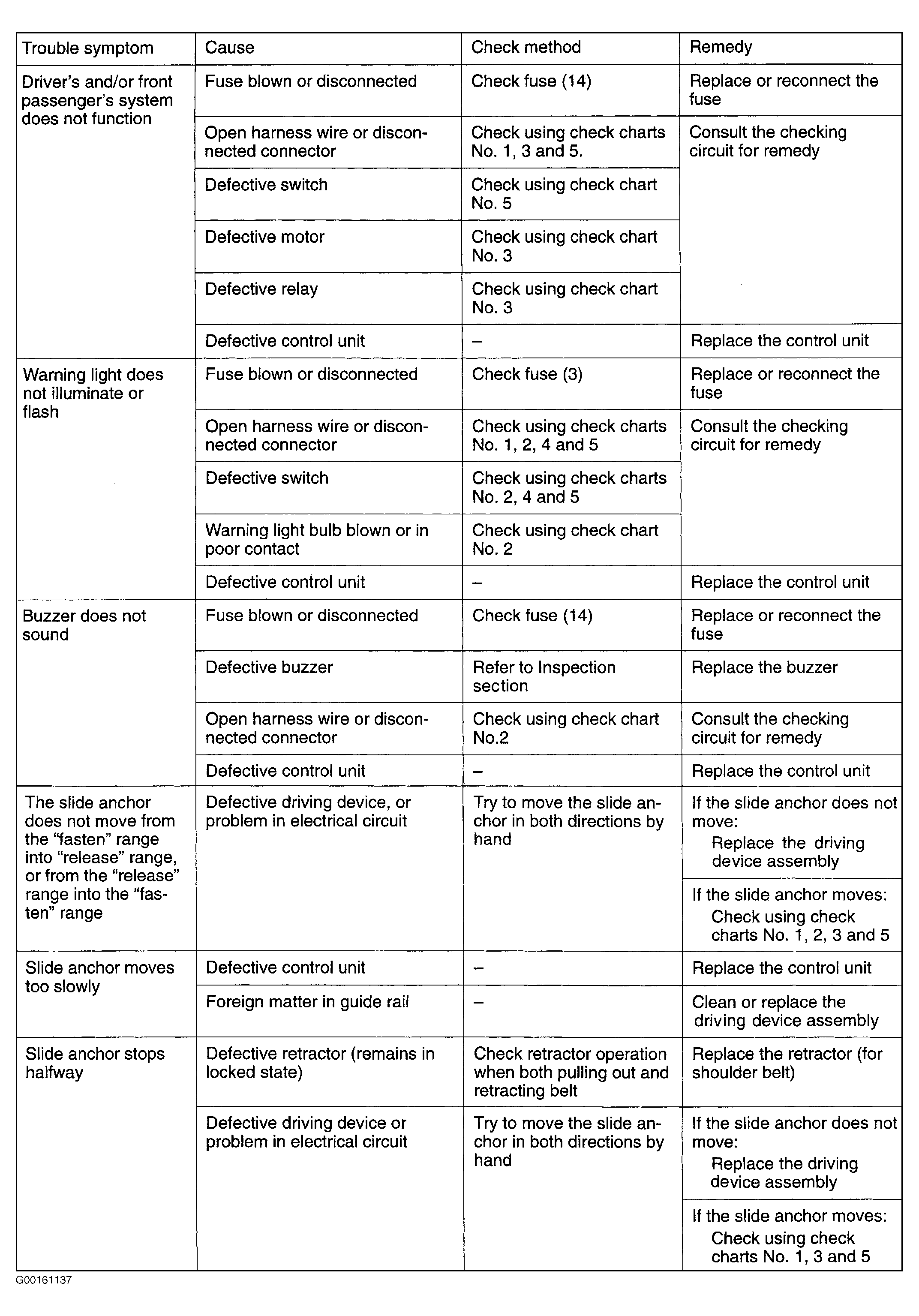 Verify customer complaint by operating automatic seat belt system. Visually inspect for obvious signs of mechanical and electrical damage. Trouble shoot customer complaint by symptom. See Fig 1 . When performing trouble shooting by symptom, refer to circuit testing as directed. See CIRCUIT TESTS .