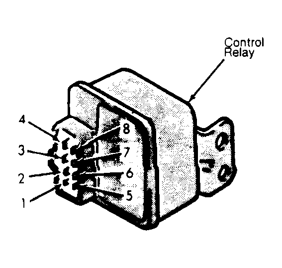 - While grounding terminal No. 5 and applying battery voltage to terminal No. 2, ensure resistance between terminals No. 1 and 4 is zero ohms. Replace control relay if it does not test as described.