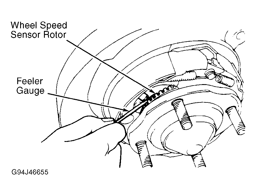 2. Using a feeler gauge, check clearance between speed sensor pole and rotor tooth surface. SeeFig 1 or Fig 2 . Also, refer to the WHEEL SPEED SENSOR-TO-ROTOR GAP SPECIFICATIONS  table. If clearance is not within specification, loosen sensor mounting bolt. Adjust sensor position until clearance is within specification. Tighten sensor mounting bolt.
