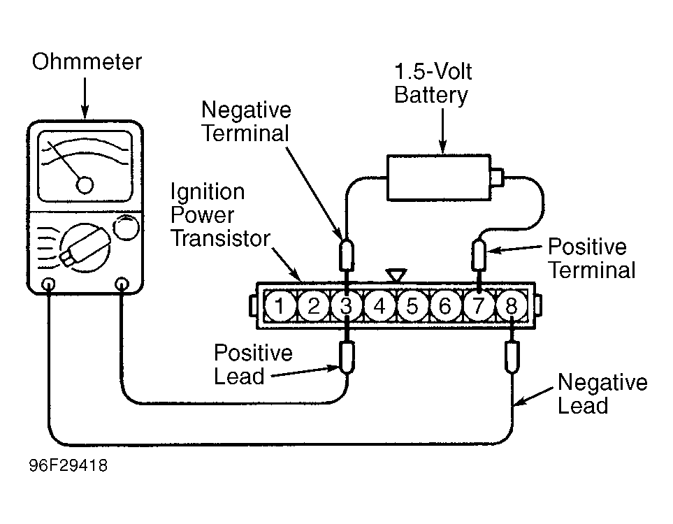 5. Disconnect positive terminal of 1.5-volt power supply from terminal No. 7 of ignition power transistor. Continuity should no longer exist between terminals No. 3 and 8 of ignition power transistor. Replace ignition power transistor if continuity is not as specified.