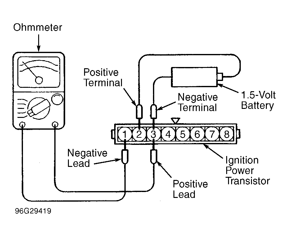 2. To check ignition power transistor for cylinders No. 1 and 4, connect analog type ohmmeter between terminals No. 3 and 8 of ignition power transistor. See Fig 1 .