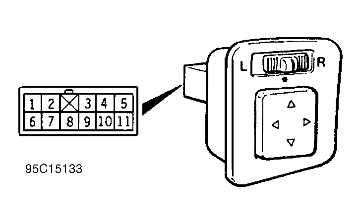 Using ohmmeter, check continuity between power mirror switch connector pins with switch in designated position. See POWER MIRROR SWITCH CONTINUITY TEST . See Fig 1 . If continuity is not as specified, replace power mirror switch.