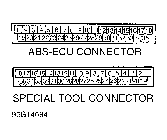 - To check voltage or resistance on ABS-ECU terminals, use Adapter Harness (MB991356). Terminal arrangements on ABS-ECU and special tool will be reversed. Use terminals from special tool when testing (for example, for testing ABS-ECU connector terminal No. 18, use terminal No. 1 on special tool). See Fig 1 .