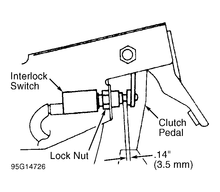 Lock front wheels, apply parking brake and put shift lever in 5th gear. Adjust clutch pedal height. See CLUTCH PEDAL HEIGHT . Ensure interlock switch clearance when clutch pedal is fully depressed 5.9" (150 mm). See Fig 1 . Loosen lock nut and adjust switch gap between clutch pedal and interlock switch to .14" (3.5 mm).