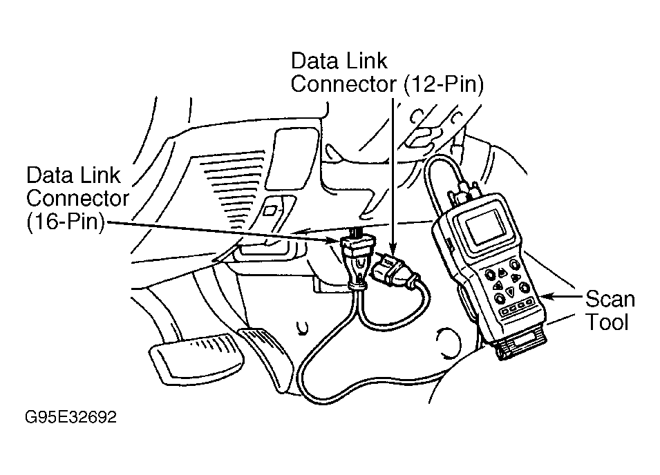 - Using fuel pressure gauge hose, connect Fuel Pressure Gauge (C-4799) to fuel pressure test port on fuel rail, located at center of fuel rail. Connect scan tool to Data Link Connector (DLC), located below the driver's side of instrument panel. See Fig 1 .