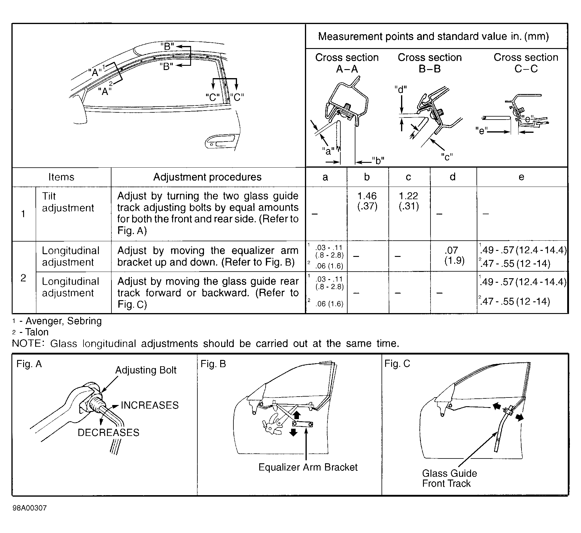 Location Dimension In. (mm) Section A-A "A" .07 (1.9) "B" .15-.23 (3.8-5.8) Section B-B "C" .21-.29 (5.3-7.3) "D" .07 (1.9) Section C-C "E" .47-.55 (5.3-7.3) NOTE: In following step, if clearance is too small, window will be damaged. If clearance is too large, rattling will occur. - Close door and raise window fully. Check window gaps. See Fig 3