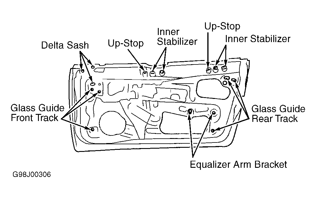- Lower the window before loosening the delta sash bolts. Refer to Fig 1 . Raise the window and adjust to specifications. Refer to Fig 2 . Remove weatherstripping from area to be measured (one area at a time). Push up stops against lift arm bracket of regulator. Tighten bolts. Ensure dimensions "a" and "d" are held while tightening front and rear guide tracks. Tighten equalizer arm bracket bolts. Align delta sash to front edge of window and tighten bolts.