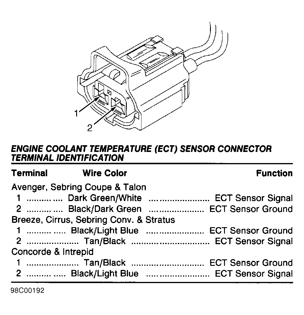 Fig 16: Identifying Engine Coolant Temperature (ECT) Sensor Connector (Avenger, Breeze, Cirrus, Sebring Coupe, Sebring Conv., Stratus & Talon)