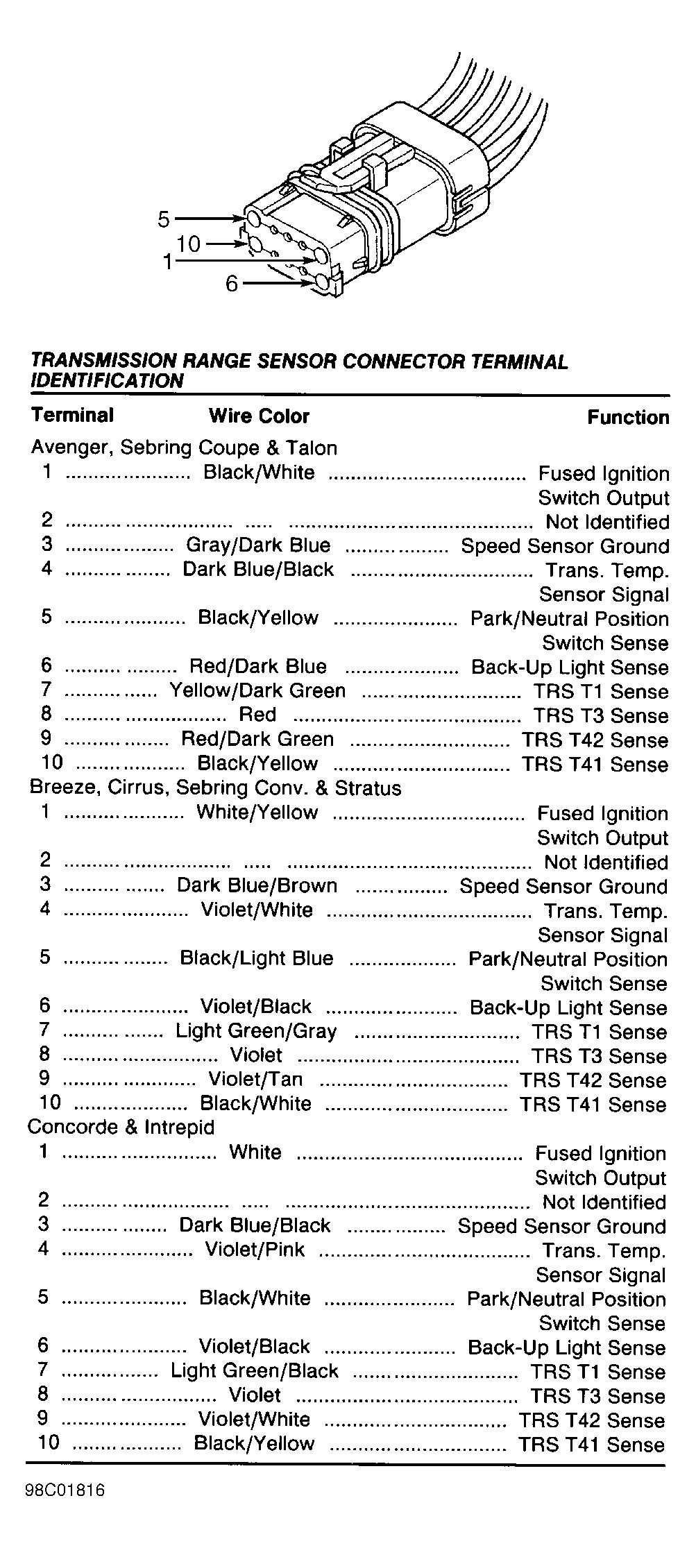 Fig 74: Identifying Transmission Range Sensor Connector (Avenger, Breeze, Cirrus, Sebring Conv., Sebring Coupe & Talon)