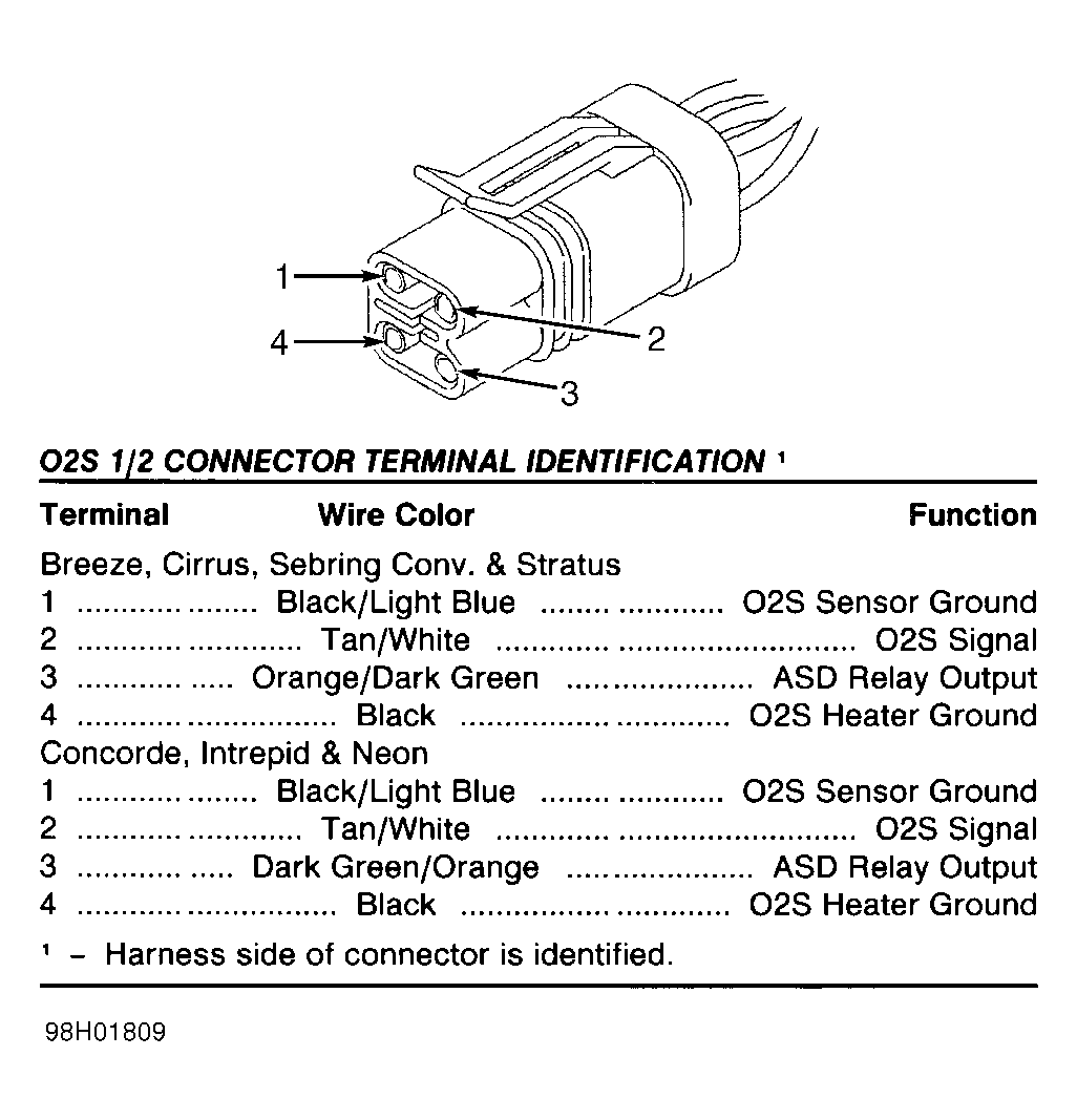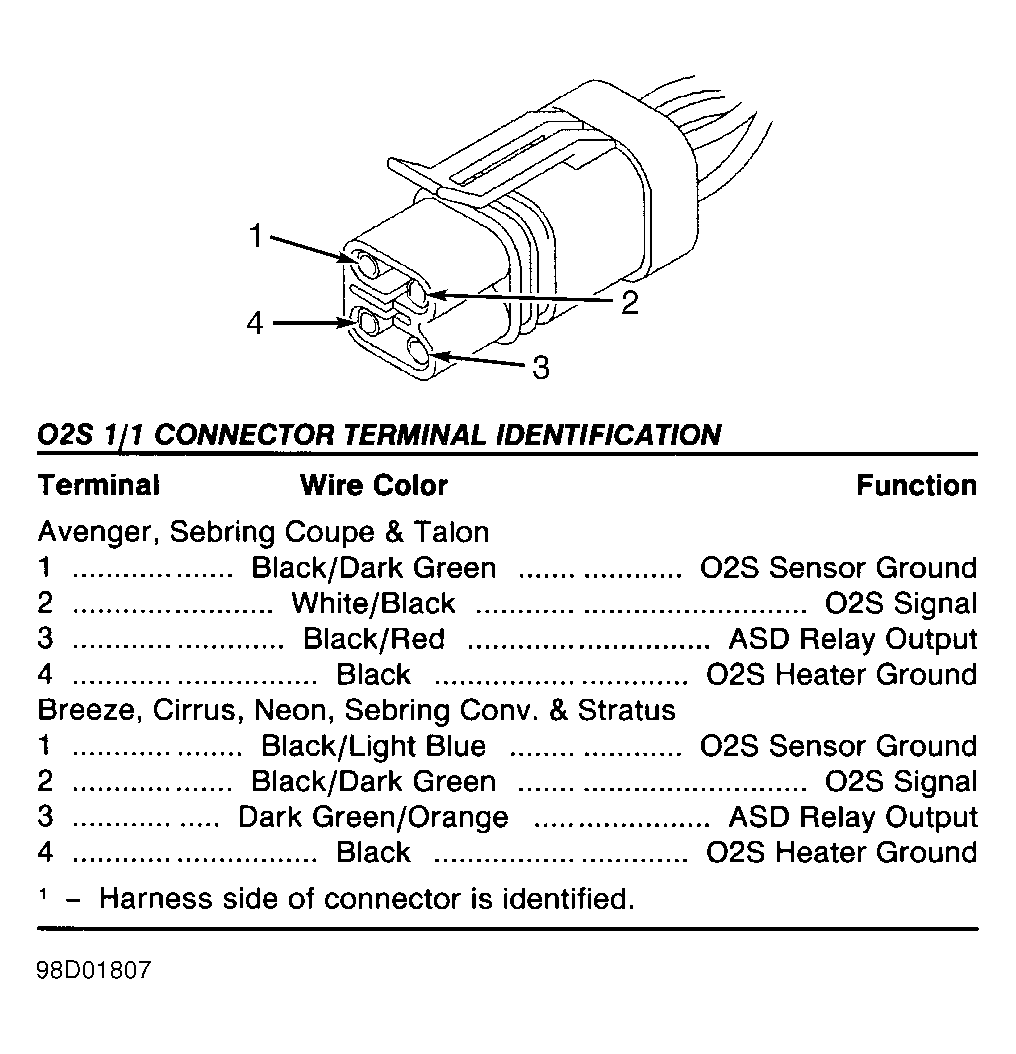 Fig 52: Identifying O2S 1/1 Connector (Harness Side) (Avenger, Breeze, Cirrus, Neon, Sebring Coupe, Sebring Conv., Stratus & Talon)