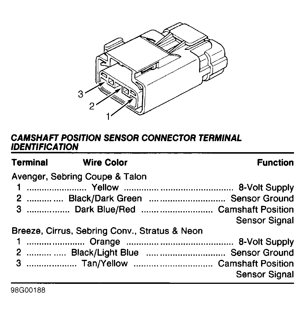 Fig 9: Identifying Camshaft Position Sensor Connector (Avenger (2.0L), Breeze (2.0L & 2.4L), Cirrus, Neon, Sebring Conv. (2.4L), Sebring Coupe (2.0L), Stratus (2.0L & 2.4L), & Talon)