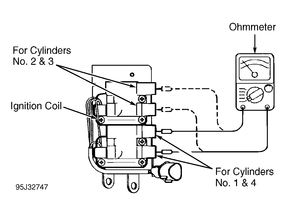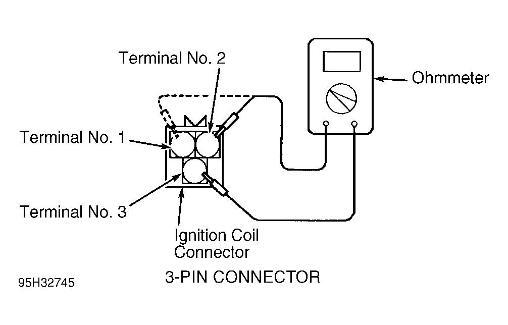 - To check ignition coil primary resistance, use ohmmeter and check resistance between terminals No. 1 and 3 on ignition coil connector for cylinders No. 2 and 3. See Fig 2 .