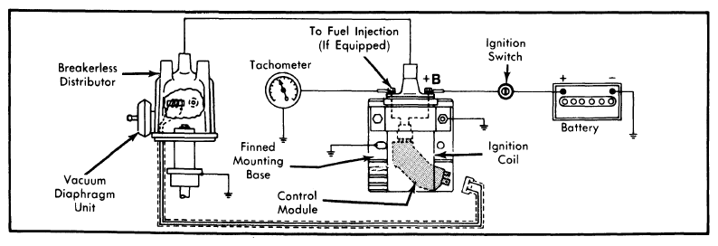 The control module's current limiter provides a constant current flow to the primary circuit, preventing coil damage. The module analyzes the electrical signals from the distributor pick-up coil assembly and provides the coil with proper dwell time and spark timing regardless of engine speed.