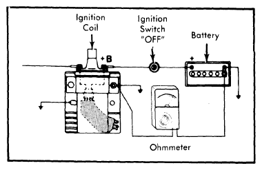 - Turn ignition switch "OFF". Connect ohmmeter leads to battery ground terminal and ignition coil ground stud. See Fig 1.
