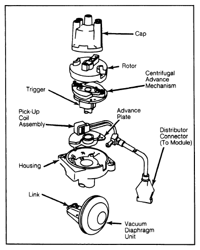 - Remove pick-up coil ground screw and advance plate retaining screws. Disconnect vacuum diaphragm unit from peg on bottom of advance plate. Remove vacuum unit, pick-up coil assembly, and advance plate from housing.