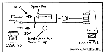 When vacuum is applied to vent valve diaphragm, the vacuum vent valve closes and the check valve opens to actuate the distributor diaphragm. The vent valve momentarily dumps vacuum to the atmosphere when CSSA ported vacuum switch changes from a manifold vacuum signal to a ported vacuum signal. The vent valve will also dump vacuum to the atmosphere when ported vacuum signal is weak, during closed throttle, and during wide open throttle. When ported vacuum is low, the diaphragm relaxes and the dump valve opens.