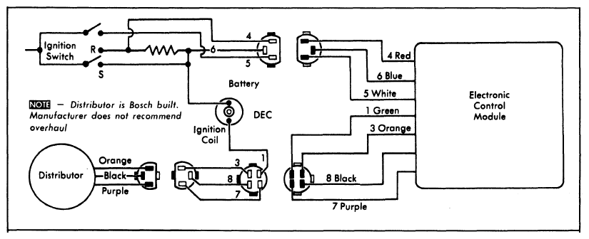 Module contains seven color coded wires. See Figure. Module receives power from ignition switch through Red wire while engine is running and through White wire while engine is cranking. Orange and Purple wires transmit signals from distributor while Green wire receives primary ignition current from coil which is then transmitted to ground at distributor through Black wire. System protection is provided through Blue wire, which is a fusible link. The electronic module cannot be repaired.