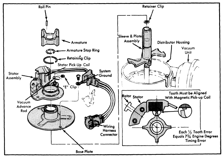 A 4-tooth armature (reluctor) and a stator (pickup coil) combine to signal the control module when to turn the ignition coil off and on. See Fig 1. The distributor has both centrifugal and vacuum advance mechanisms for altering spark timing.