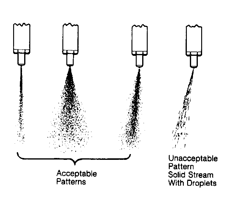 - Build up pressure in the injector tester to just below injection starting pressure. Quickly lower handle on tester and observe fuel spray pattern. Fuel should be uniformly atomized and should form a narrow cone projecting straight out of the end of the nozzle. See Fig 1 .
