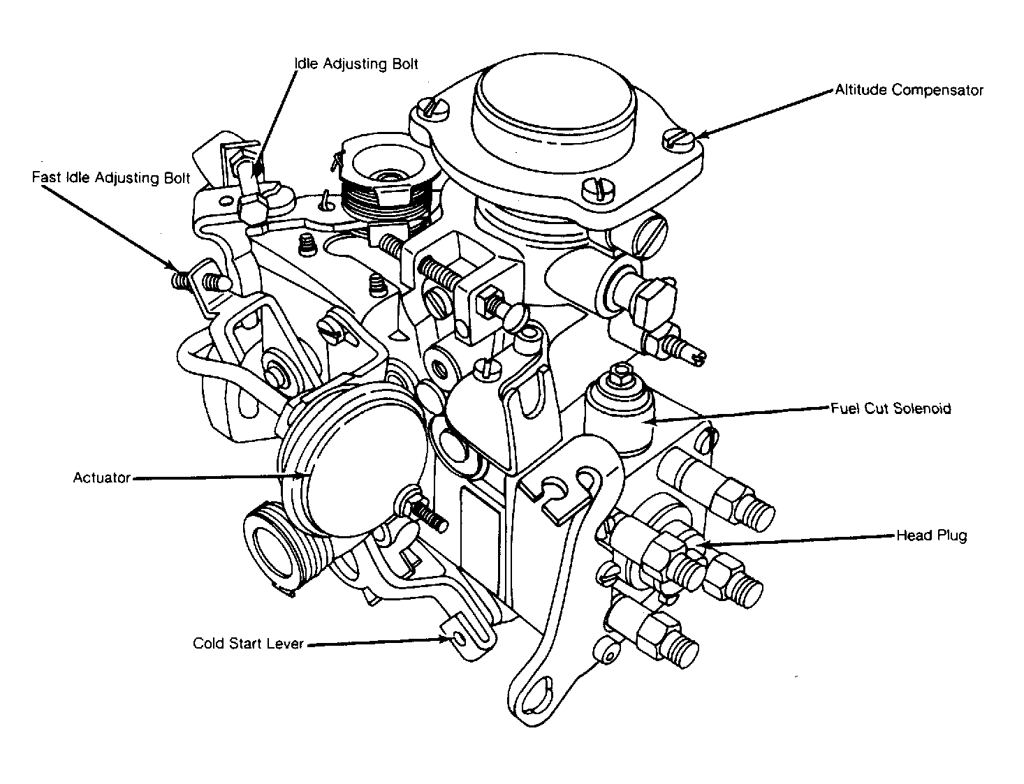 The injection pump is a vane type pump and is driven by the engine timing gears. An altitude compensator and a cold start device are installed on the pump to modify injection duration as necessary. The distributor portion of the pump contains a fuel cut solenoid to stop fuel flow to the injectors after the ignition switch is turned off. See Fig 1 .
