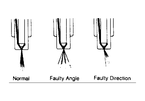 - Build up pressure in the injector tester to just below injection starting pressure. Quickly lower handle on tester and observe fuel spray pattern. Fuel should be uniformly atomized and should form a narrow cone projecting straight out of the end of the nozzle. See Fig 1 .