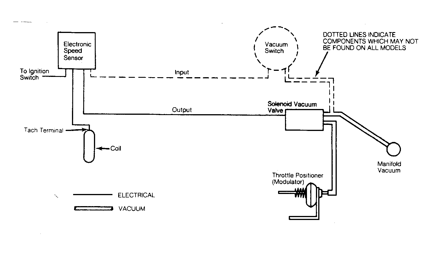 System consists of governor module or speed sensor, ported vacuum switch (some models), solenoid vacuum valve, throttle positioner (modulator) on throttle linkage, electrical wiring and vacuum hoses. See Figure .