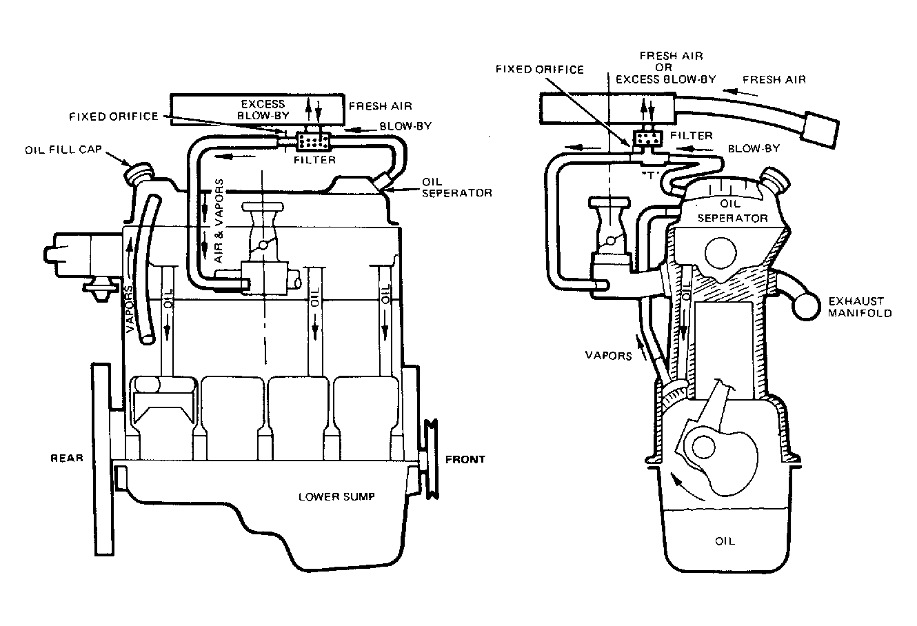 Crankcase ventilation systems are designed to prevent contaminating hydrocarbons from escaping to the atmosphere. This is accomplished, in most cars, by routing vapors from the crankcase through a vacuum-controlled ventilating valve (PCV Valve) into the intake manifold. The vent system for the 1.6L does not use a PCV system. The system used in the 1.6L engine evacuates crankcase vapors that are drawn into the intake manifold in metered amounts according to the manifold depression and the fixed orifice as they became available (see Fig 1 ). If the availability is low, air may be drawn in along with the vapors. If the availability is high, some vapors will be delivered to the intake manifold and any amount over that will go into the air cleaner. The fixed orifice is the critical point of the system and determines the amount of blow-by that is routed back to the combustion chamber.