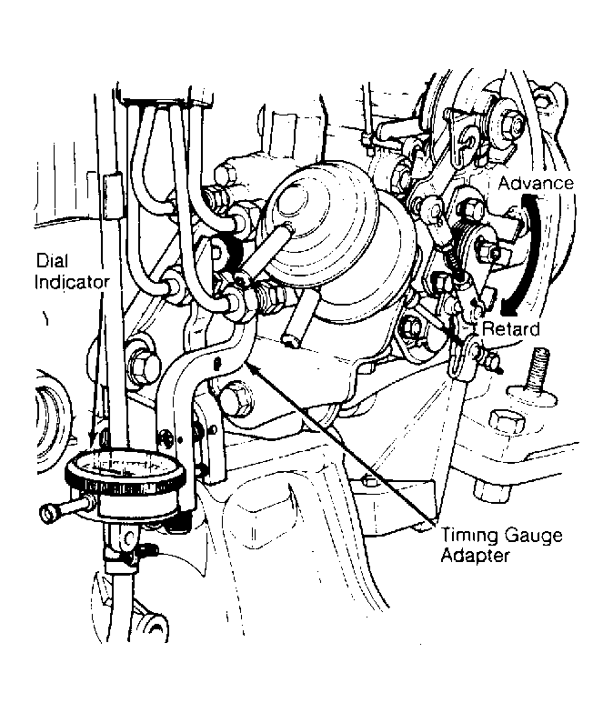 - If reading is not within specifications, loosen injection pump attaching bolts and nuts. Rotate injection pump toward engine to advance timing and away from engine to retard timing.