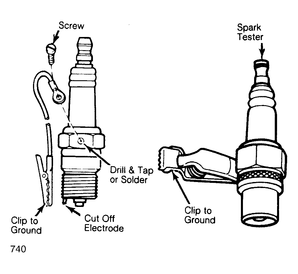 Use a spark tester tool (if available), or modify a spark plug (cut off side terminal and install spring clip for grounding plug housing) for use in testing ignition system. See Fig 1.