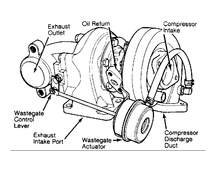The 5 major components of the turbocharger are the compressor, turbine, wastegate actuator, wastegate, and a water-cooled center housing. See Figure .