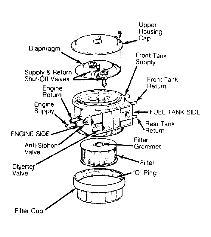 - Apply regulated air pressure to either of the supply ports on the fuel tank side of reservoir. Remove regulated air and apply to return tube on engine side of reservoir. If air exhausts from one tank side return port, proceed to next step. Replace reservoir if air did not exhaust from one tank side return port.