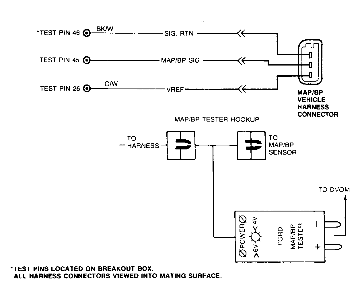 - Check Power to MAP/BP Sensor. Use Ford Motor Co. MAP/BP tester for this test. Turn key off and disconnect MAP/BP sensor. Connect MAP/BP tester between harness and MAP/BP sensor. See Fig 2 . Connect banana plugs of tester into DVOM and set DVOM on 20-volt scale. With tester connected, turn key on. If Green light is on, go to next step. If light is not on, repair open in VREF circuit, remove MAP/BP tester. Reconnect components and retest symptom.