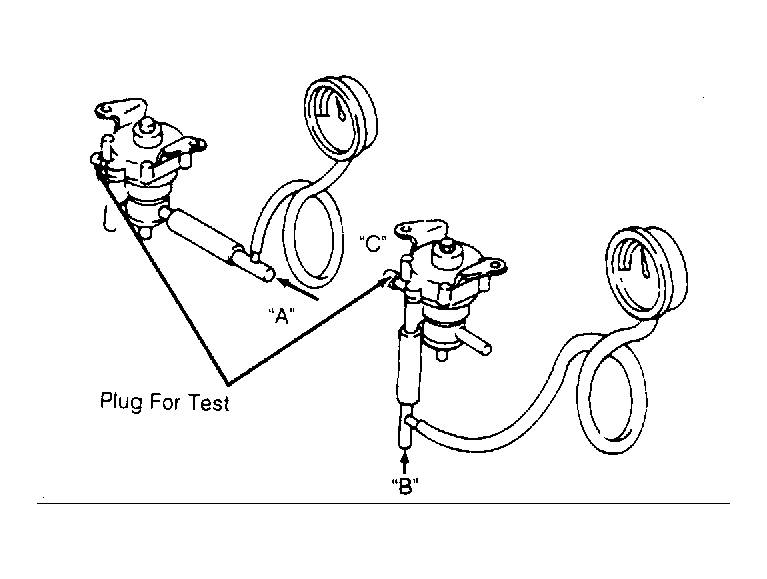 1. Remove rollover vent valve and position it horizontally. Tee in a pressure gauge to the hose normally leading to the fuel tank, plug port "C" and blow into port "A". See Fig 1 . Verify that the valve opens at .78-1.0 psi (.055-.07 kg/cm2 )