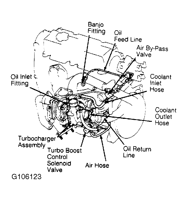 1. Remove small air tube from turbocharger inlet air hose. Disconnect turbo boost control solenoid valve electrical connector. See Fig 1 .