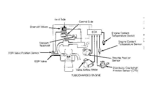 The Exhaust Gas Recirculation (EGR) system distributes exhaust gas into the intake mixture. This lowers combustion temperatures due to lower concentrations of oxygen. Lowering of combustion temperatures reduces amount of NOx emissions. The non-turbocharged engine EGR is vacuum controlled and the turbocharged engine uses electrical control. See Fig 1 .