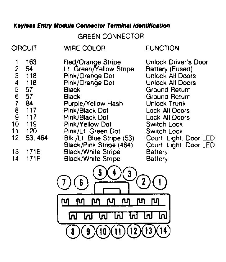 2. With Brown connector disconnected, check for short between malfunctioning button and pin No. 12 in Brown connector. Refer to KEYLESS ENTRY MODULE CONNECTOR TERMINAL IDENTIFICATION in the figure. See Figure . If no short is found, go to step 4). If short is found, replace keypad and repeat QUICK TEST  .