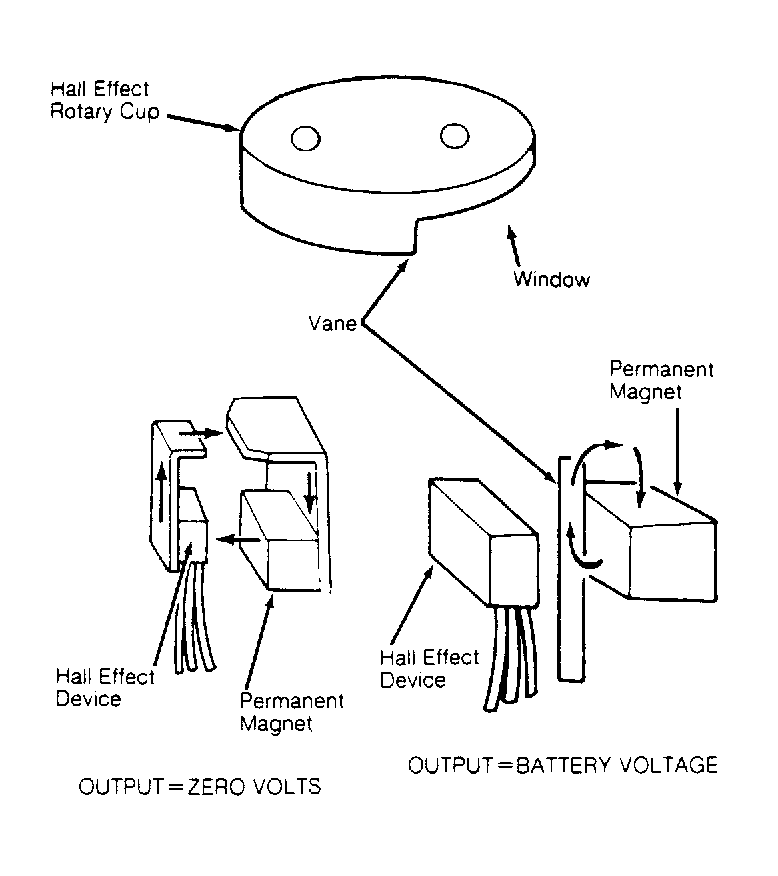 The Cylinder Identification (CID) signal is generated by a single toothed vane cup hall device driven by camshaft that produces one signal every camshaft revolution, or once every 2 crankshaft revolutions. See Fig 1. The 3.0L SHO CID sensor is mounted at end of the rear camshaft. The 3.8L SC CID sensor is mounted in normal distributor location. See Fig 2 or Fig 3.