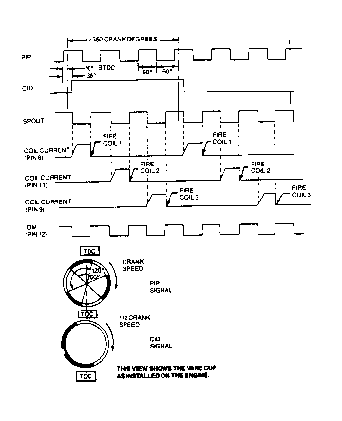 The PIP output is a 50% duty cycle (50% on and 50% off) signal that provides base spark timing information. The CID signal output is also a 50% duty cycle signal and is used so DIS module knows which coil to fire. CID signal is high (10-12 volts) for half of the cam revolution (180 degrees) and low the other half. See Fig 4.