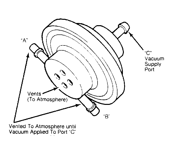 2. Apply a minimum of 6 in. Hg vacuum to WOT valve port "C". See Fig 1 . Gauge should drop to zero. If not, replace valve. Adjust WOT valve so vacuum applied by hand pump will drop when near WOT.