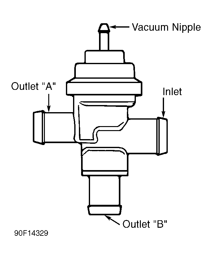 . Remove vacuum line at vacuum nipple. Accelerate engine to 1500 RPM. Airflow should be heard and felt at outlet "B" with little or no airflow at outlet "A".