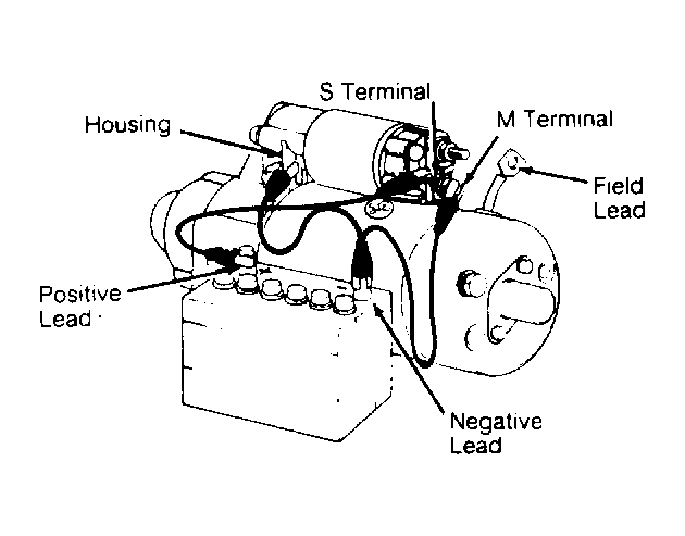 Connect test leads to starter. See Figure. Connect negative leads to starter housing and "M" terminal. Connect battery positive lead to "S" terminal. If starter drive pinion does not move out, replace solenoid.