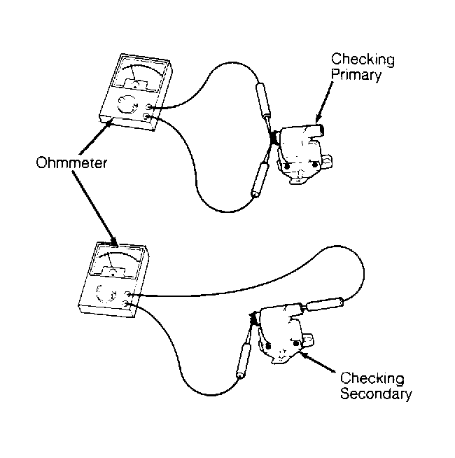 1. Inspect coil for signs of arcing or leakage. Remove primary and secondary leads from ignition coil. Using ohmmeter, check primary resistance between (positive) and (negative) terminals of coil. See Fig 1 .