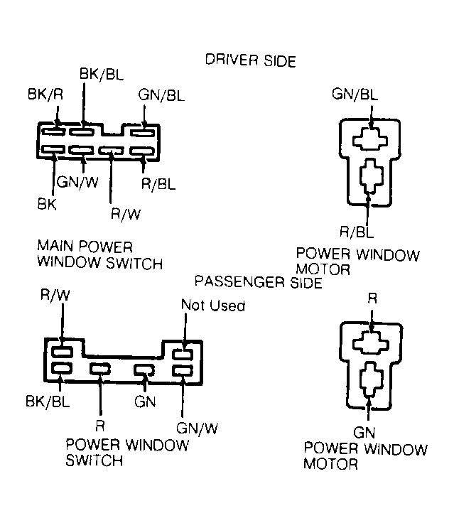 12. Check for battery voltage on Black/Blue wire at driver's window switch. If battery voltage is present, repair Black/Blue wire between passenger's window switch and driver's window switch. If battery voltage is not present, replace driver's window switch.