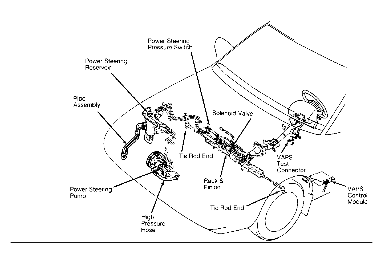 The VAPS system consists of a control module, steering angle sensor, vehicle speed sensor, solenoid valve, power steering pump, rack and pinion and inter-connecting hoses. The system continuously monitors steering wheel angle and vehicle speed to adjust steering system pressure. See Figure .
