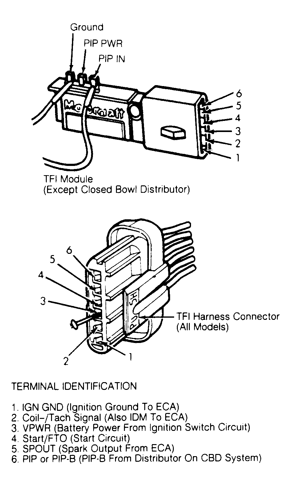 2. If resistance is as specified, suspect faulty PIP sensor/stator. If resistance is NOT as specified, replace TFI-IV module.