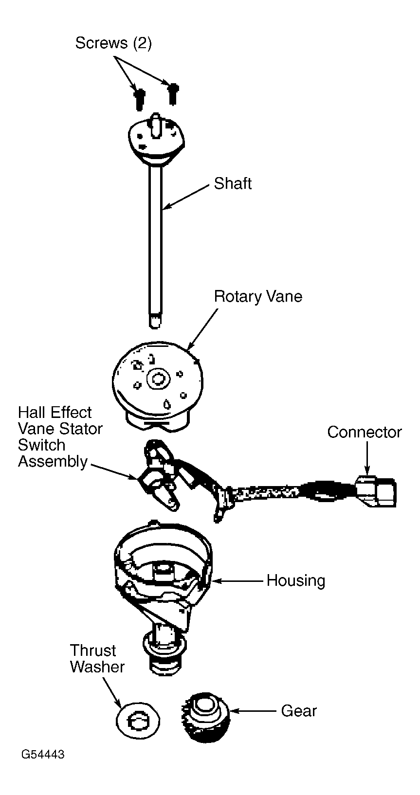 2. On all models except 3.8L, install octane rod through distributor base hole. Place end of rod onto same post as original stator. Install and tighten octane rod screw. On 3.8L models, ensure thrust washers are positioned in proper locations. See Fig 1 . On all models, lubricate distributor shaft, just below armature, with light oil. DO NOT over lubricate.