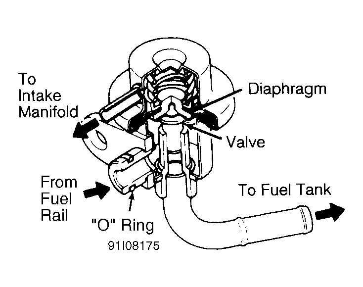 5. Stop engine and wait 5 MINUTES. If fuel pressure is still less than 21 psi, replace pressure regulator. If fuel pressure is greater than 21 psi, remove fuel pressure regulator. Check "O" ring, gasket and mounting surface for excessive wear or damage. See Fig 1 . Repair or replace as necessary. Attach vacuum pump to fuel return line.